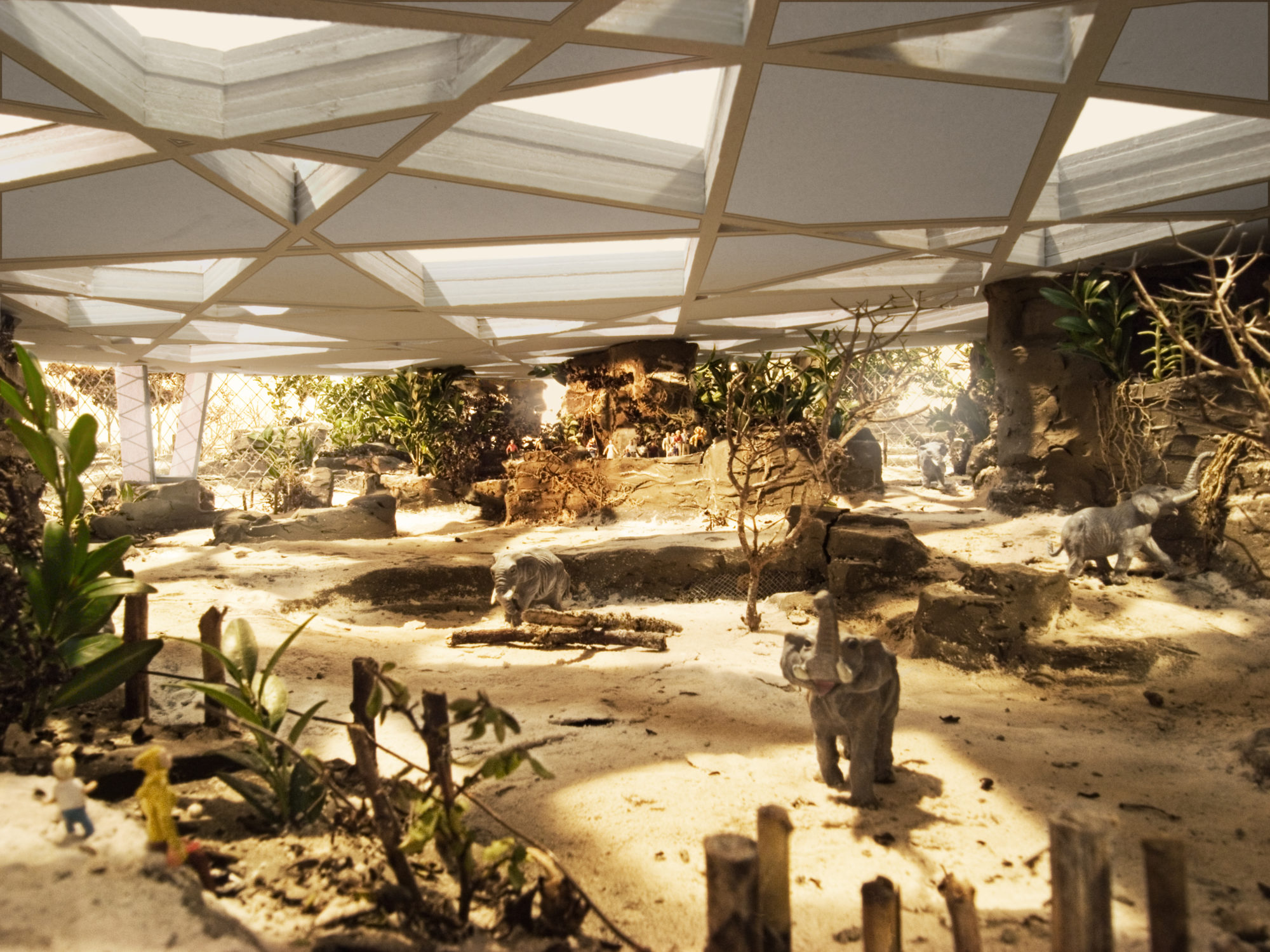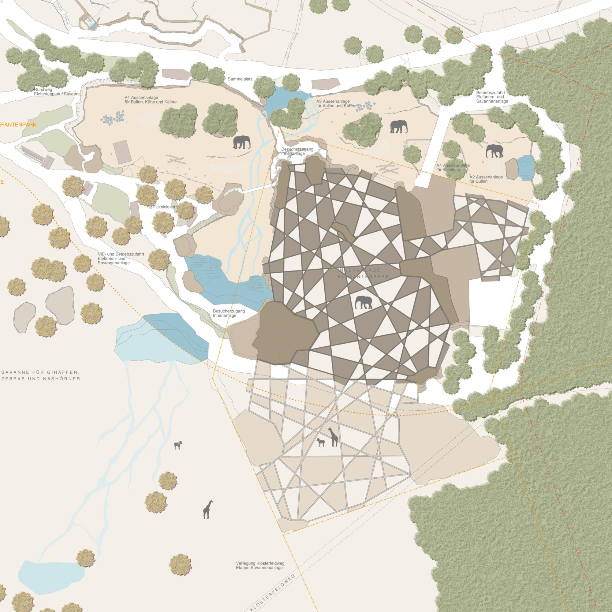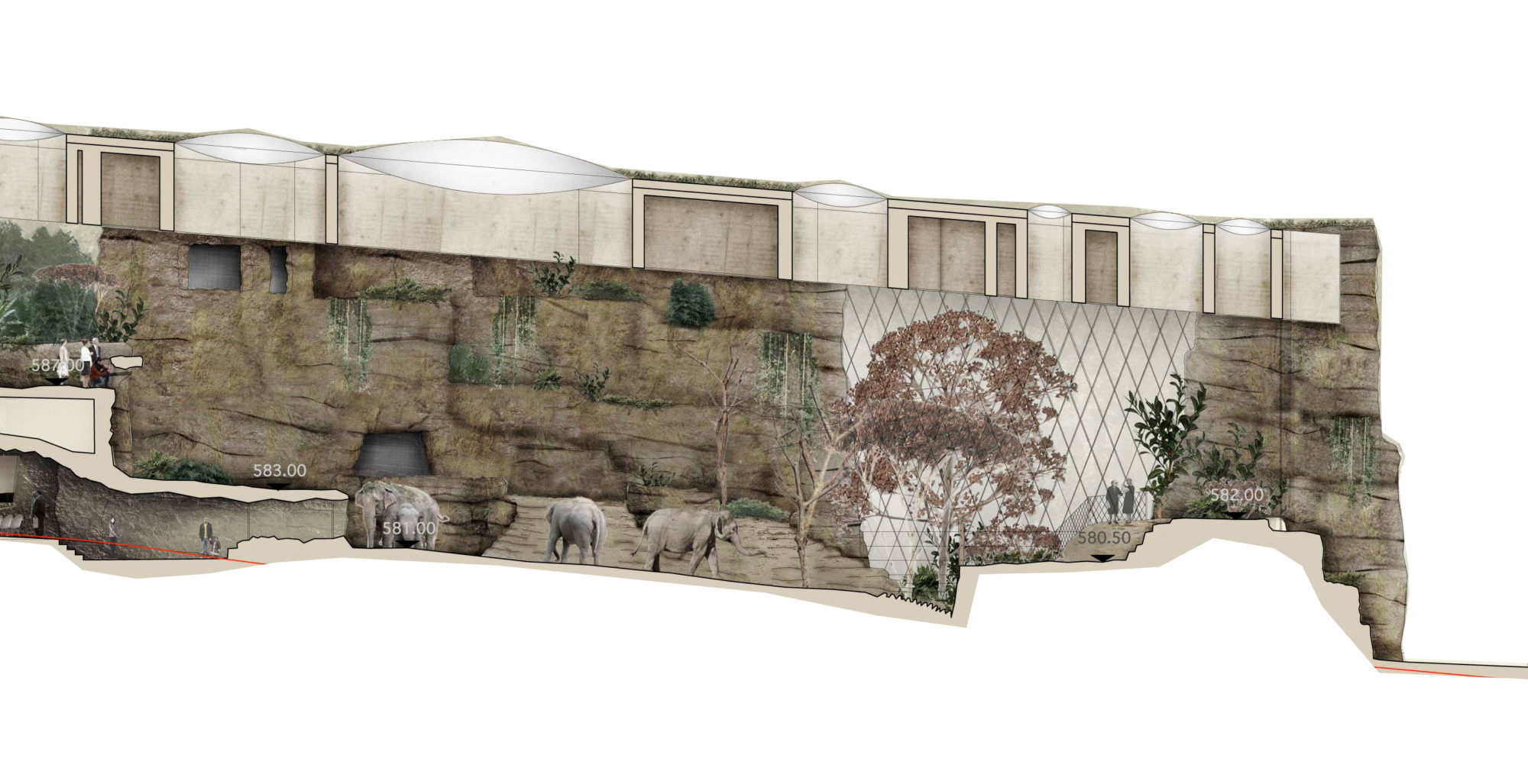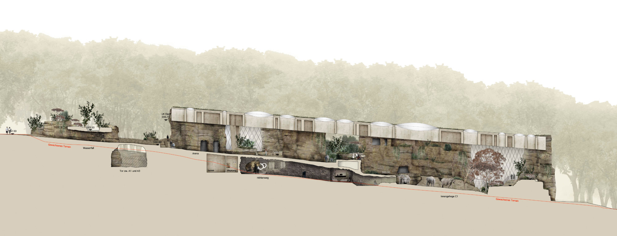 Der Entwurf für die neue Elefantenanlage des Zoo Zürich bettet sich als topographische Architektur in das abfallende Gelände und macht sich vorhandene räumliche Eigenheiten wie den Waldrand zunutze. Gebäude und Gehege der neuen Elefantenanlage sind dabei als eine sich durchdringende räumliche und gestalterische Einheit konzipiert.
