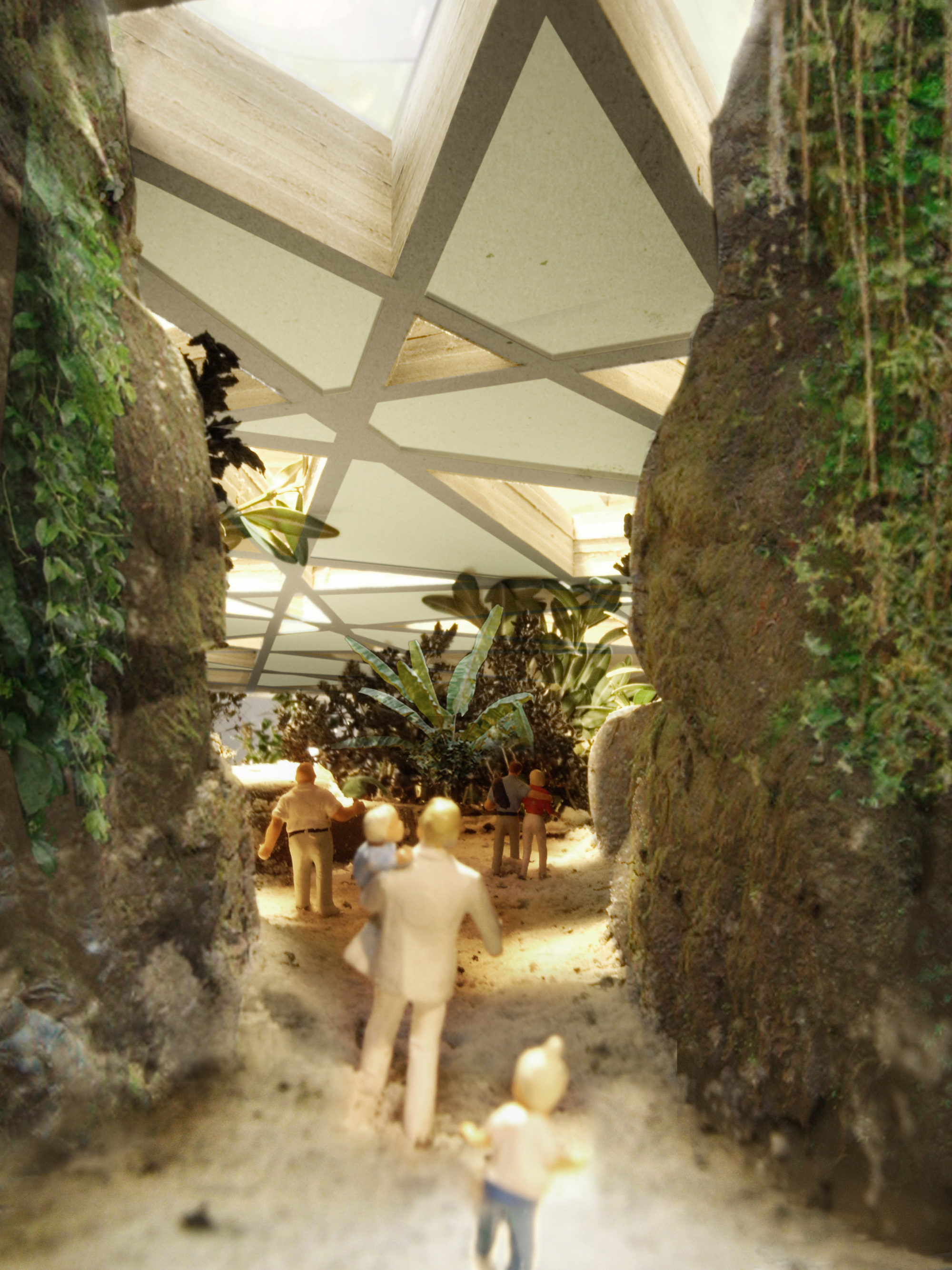 Generierendes Thema des Entwurfs ist das beinahe collagenhafte Gegenüberstellen von zwei gegensätzlichen Naturbildern: Eine quasinatürliche Inszenierung einer exotischen Landschaft versus ein abstrahiertes Bild eines Blätterdachs in Form der alles überspannenden Dachstruktur in Beton.