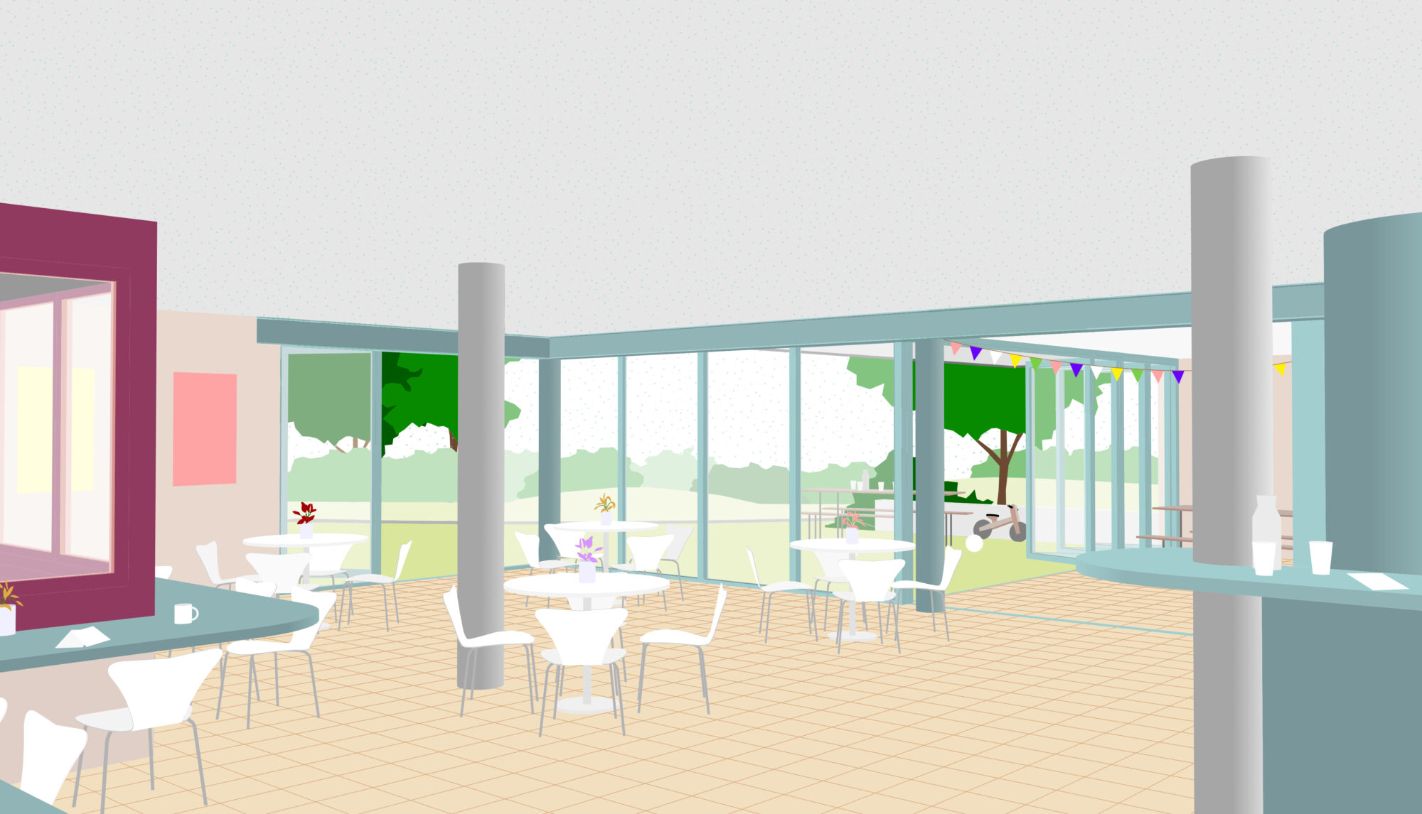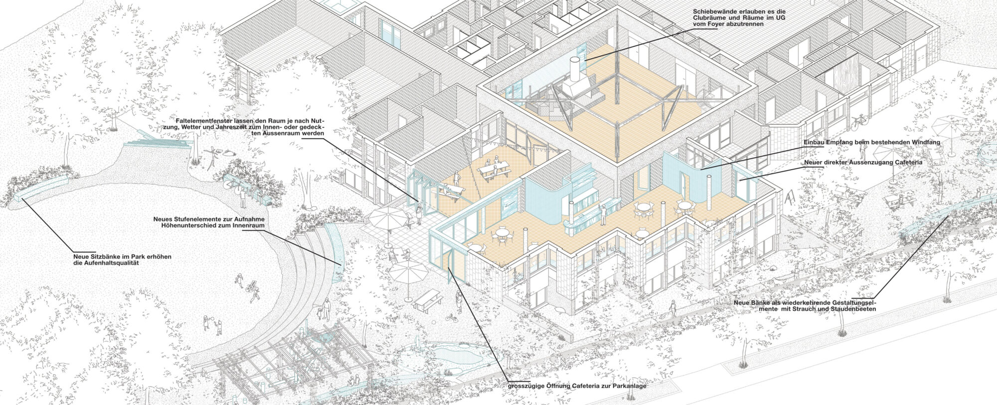 Ein zentraler Ausgangspunkt für die Intervention ist die Umnutzung der bestehenden Bibliothek zur neuen Cafeteria des Gemeinschaftszentrums. Ein heute überdeckter Aussenbereich wird hingegen zu einem Verjahreszeiten-Zimmer umgewandelt.