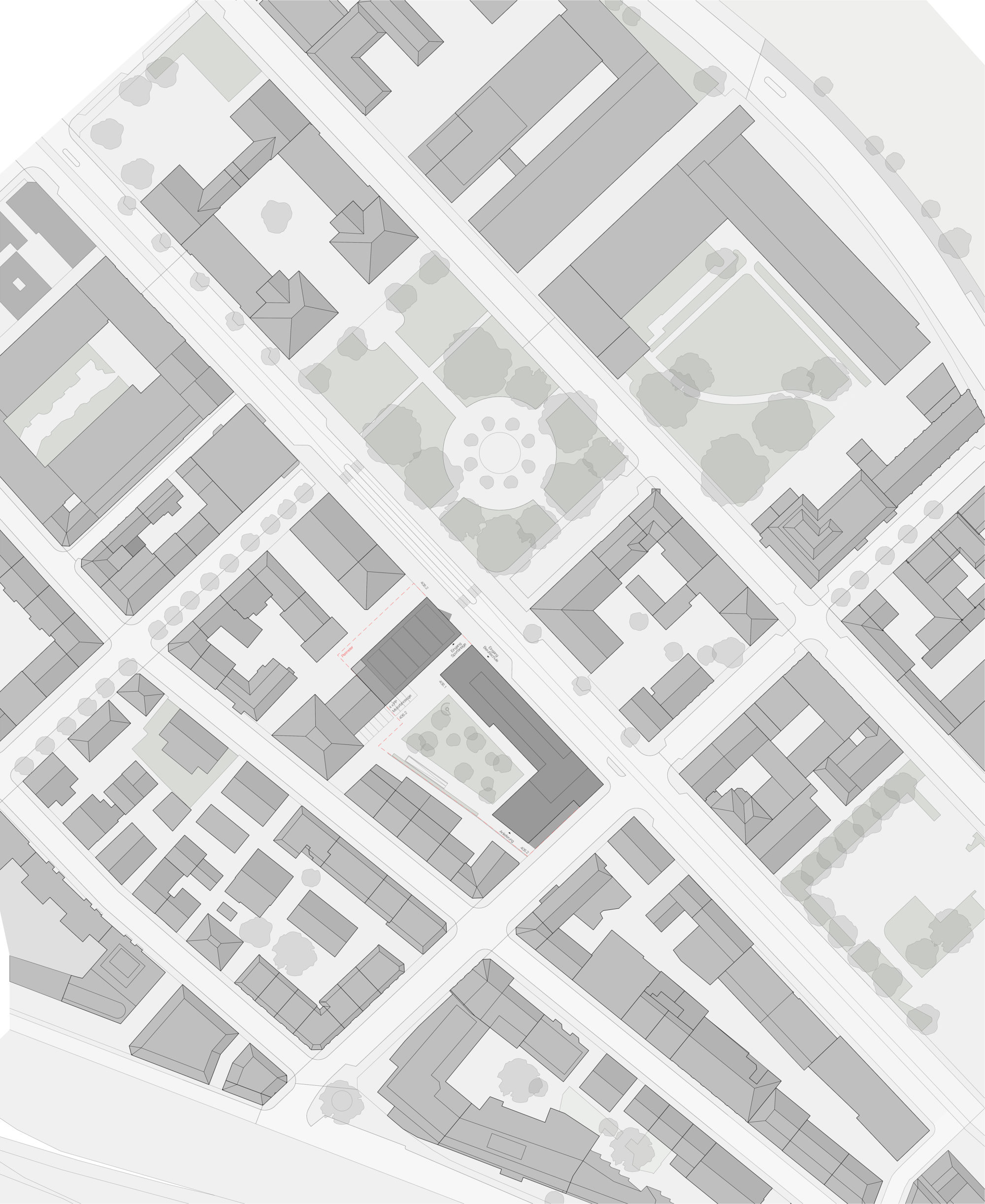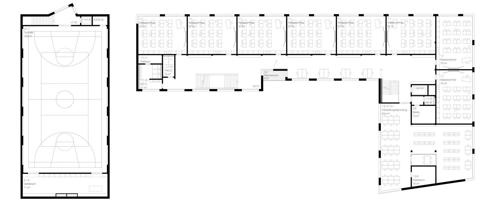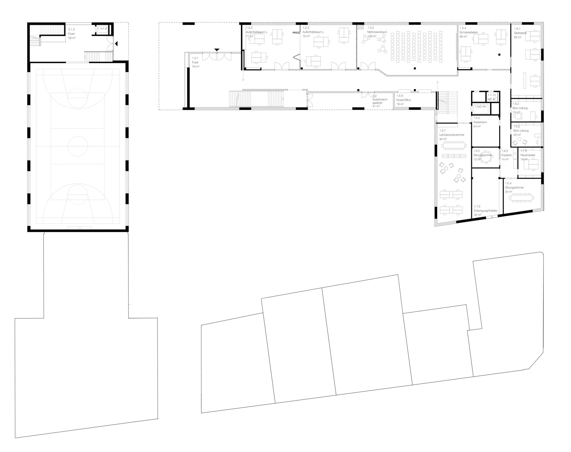 Das Programm der neuen Berufsschule wird auf zwei Häuser verteilt, ein Schul- sowie ein Sportgebäude. Diese verstehen sich - im Gegensatz zu den freistehenden Schulbauten nördlich der Limmatstrasse - als Teil der Blockrandstruktur und bilden zusammen mit den bestehenden Wohnbauten einen grosszügigen öffentlichen Hof. Das Turnhallengebäude steht quer zur Limmatstrasse und bildet zur Klingenanlage einen prägnanten Kopf aus, welcher gleichzeitig den Duchgang in den Hof markiert.