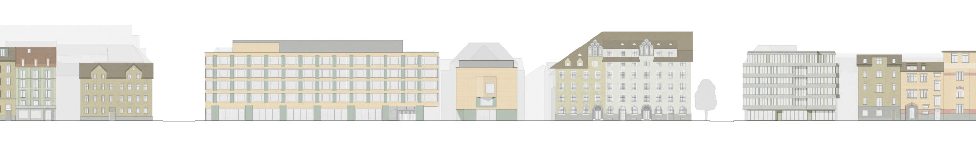 Durch seine einbündige Organisation entlang der Limmatstrasse bleibt der Baukörper der Schule schlank und verschafft dem Hofraum eine grosszügige Proportion. Alle Schulräume orientieren sich konsequent zur Strassenseite hin, während Erschliessung und Aufenthaltsbereiche am Hof gelegen sind. Der kurze Querflügel zur Hafnerstrasse nimmt die Lehrerbereiche und Verwaltung auf. Das Erdgeschoss wird als grosses offenes Forum gestaltet, welches sowohl zur Strasse wie zum Hof hin das Schulleben kommuniziert.