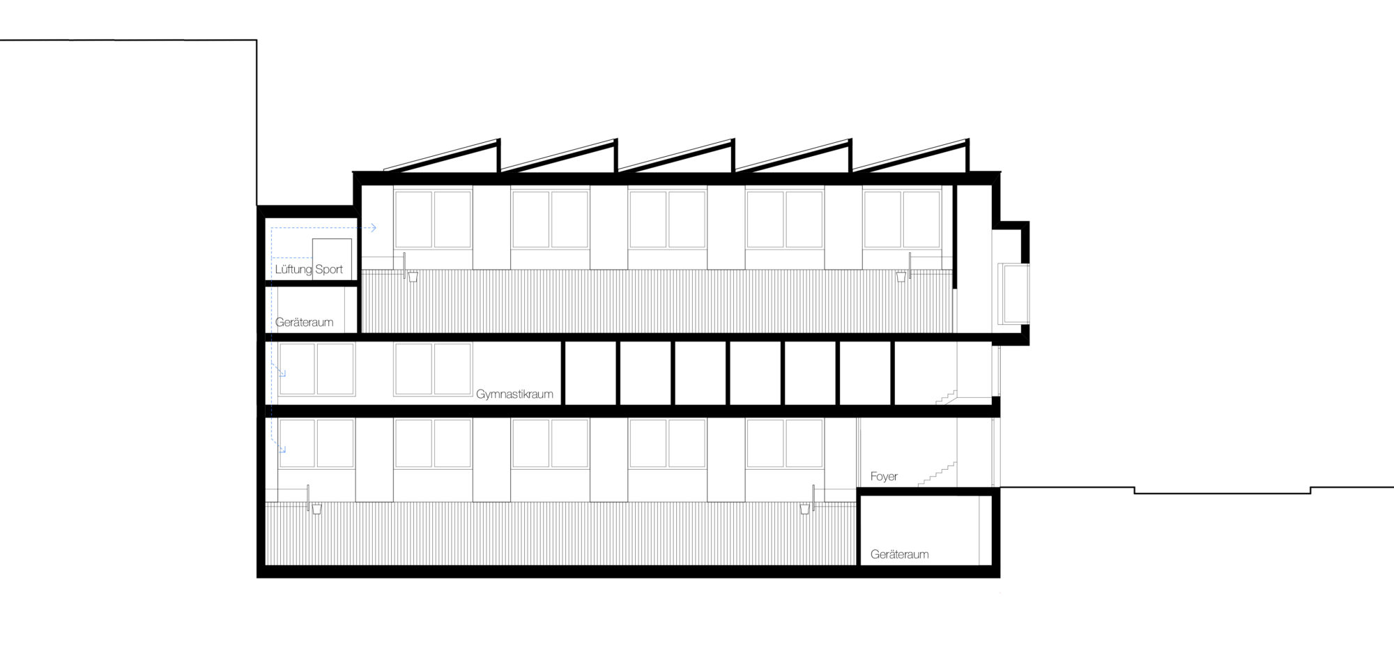 Durch das Stapeln der beiden Hallen übereinander wird der Fussabdruck des Turnhallengebäudes minimiert, gleichzeitig erhält es eine starke, eigenständige Präsenz sowohl zur Strasse als auch zum Hof hin. Der Zugang sowie die vertikale Erschliessung orientieren sich zur Limmatstrasse hin.